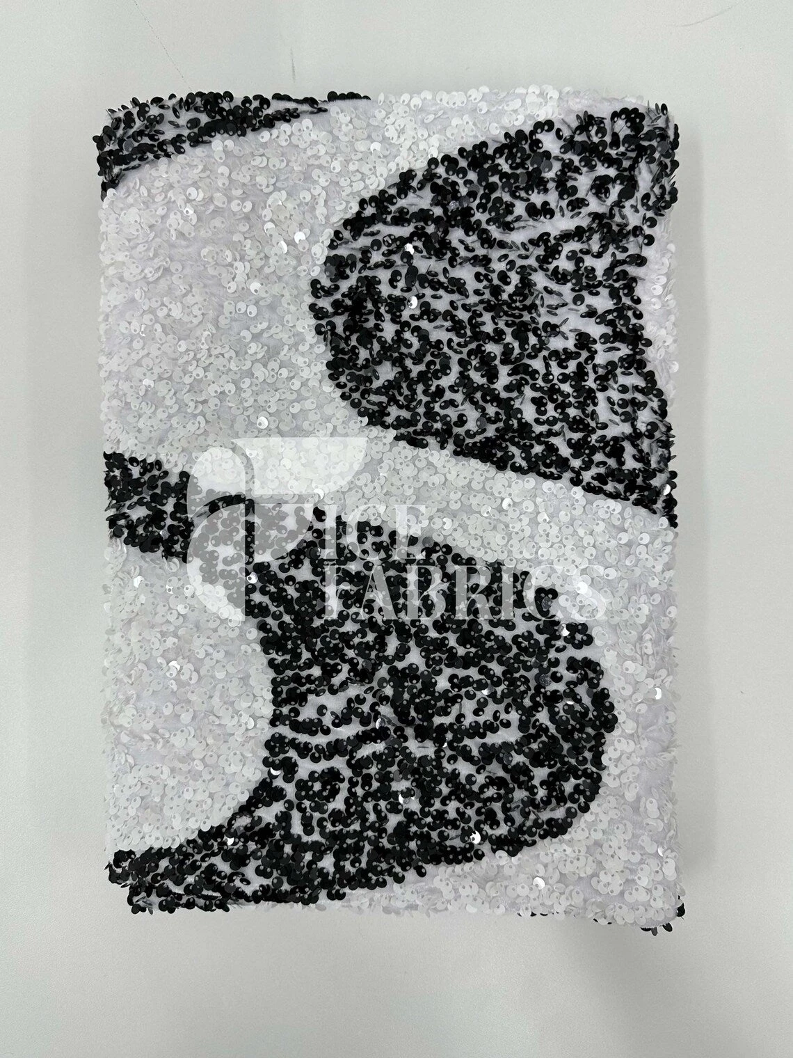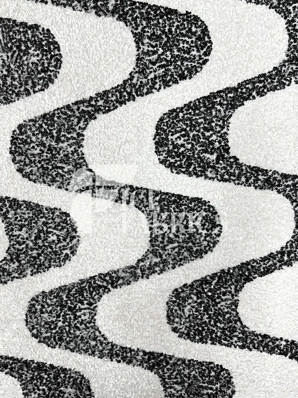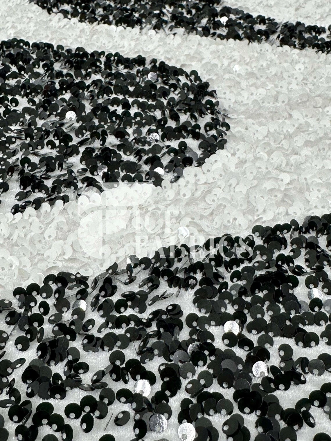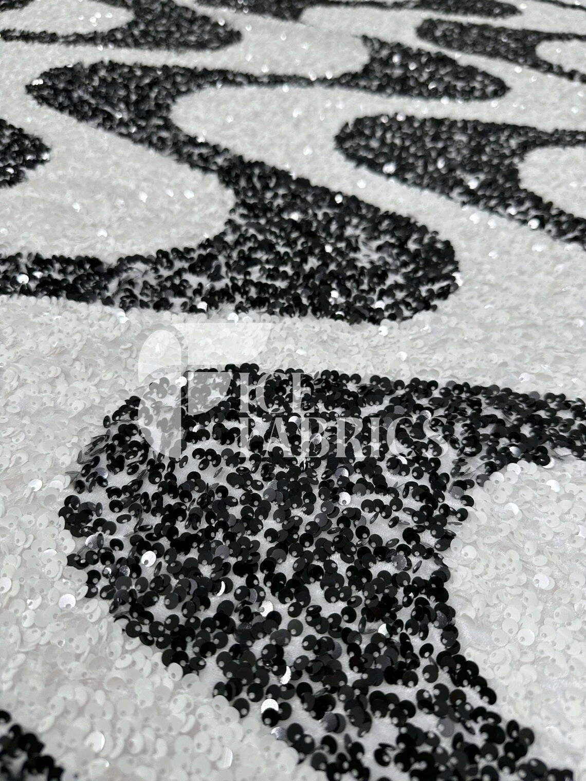 Introducing our Wavy White and Black on White Stretch Velvet Sequin Fabric, a stunning blend of luxurious velvet and shimmering sequins. This velvet sequin fabric features a unique wavy pattern created by iridescent white and black sequins on a pristine white velvet base. The result is a fabric that offers both elegance and a touch of glamour, perfect for various creative projects.