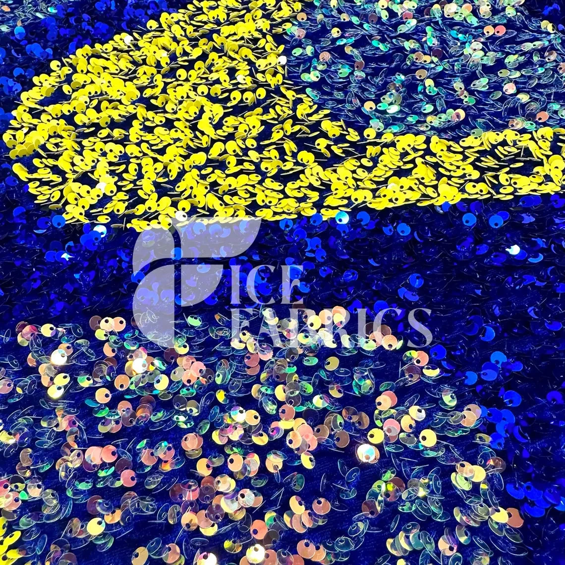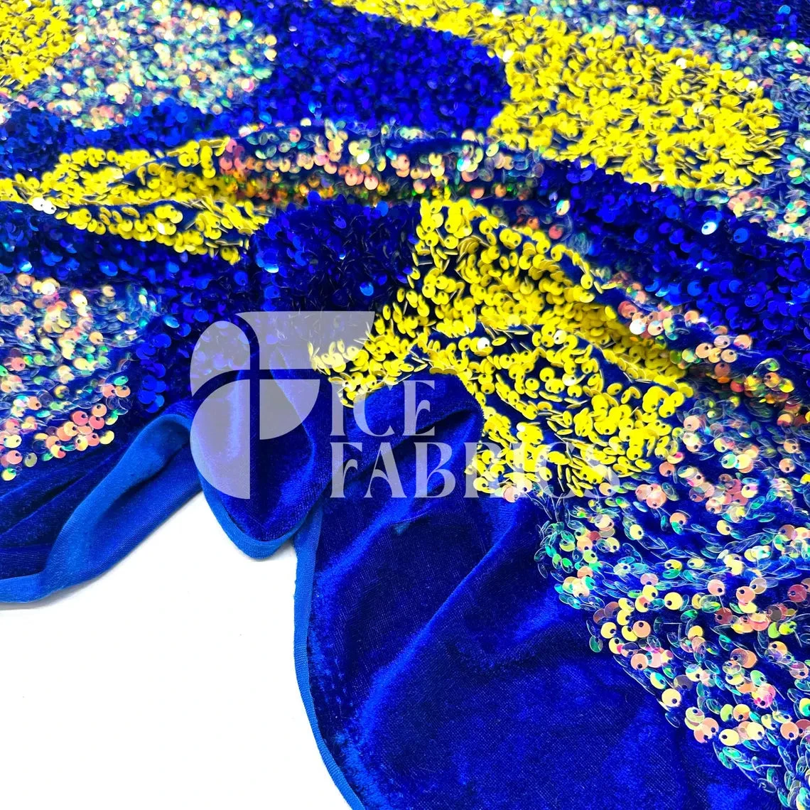 Our Wavy Yellow Royal on Blue Stretch Velvet Sequin Fabric beautifully combines the rich texture of velvet with the stunning allure of sequins, resulting in a fabric that is both luxurious and captivating. Featuring a unique wavy pattern of vibrant yellow royal sequins atop a rich blue velvet base, this velvet sequin fabric adds an extraordinary touch of glamour to any design.