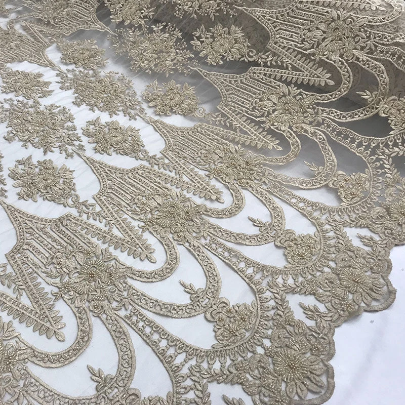 Beaded Designed Bridal Floral Embroidered Mesh Lace Fabric